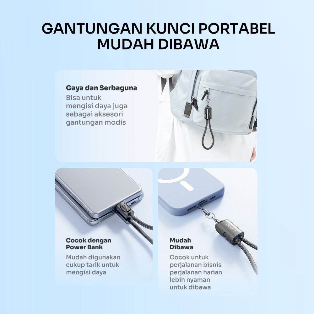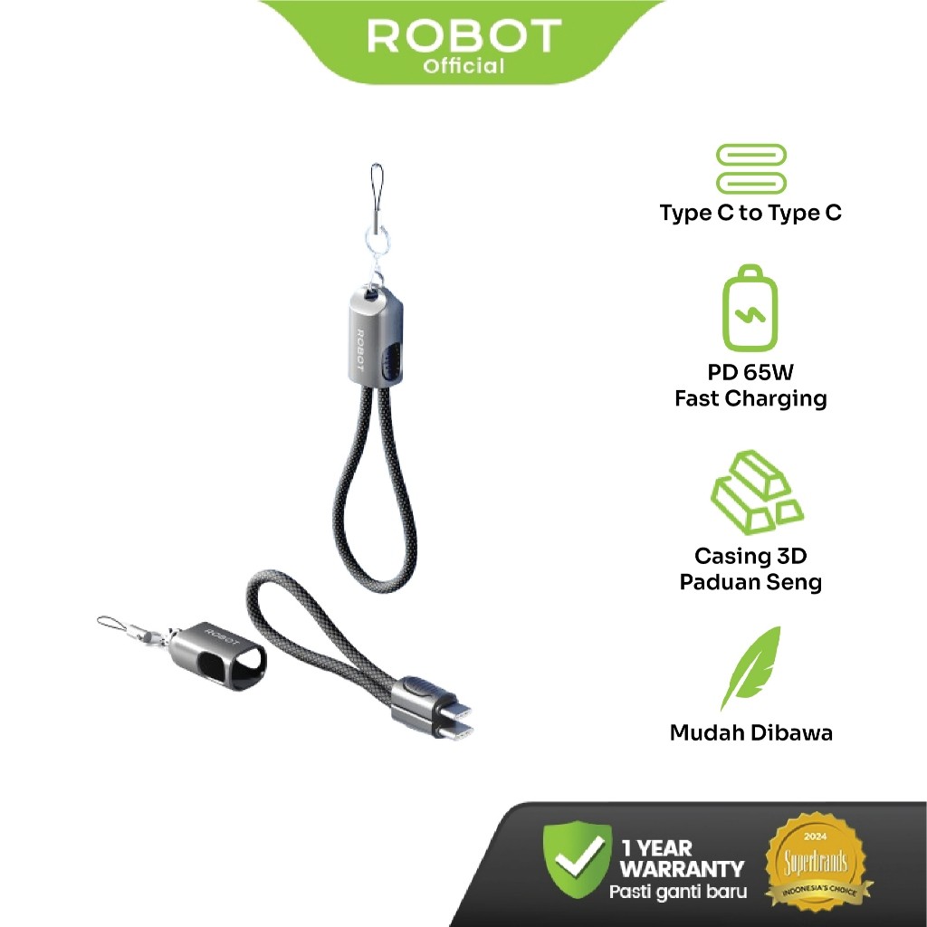 Kabel Data Fast Charging 65W ROBOT RKCL01 Black 20cm Type-C/Lightning, desain 3D, tali gantung. Originagaransi 1 tahun.