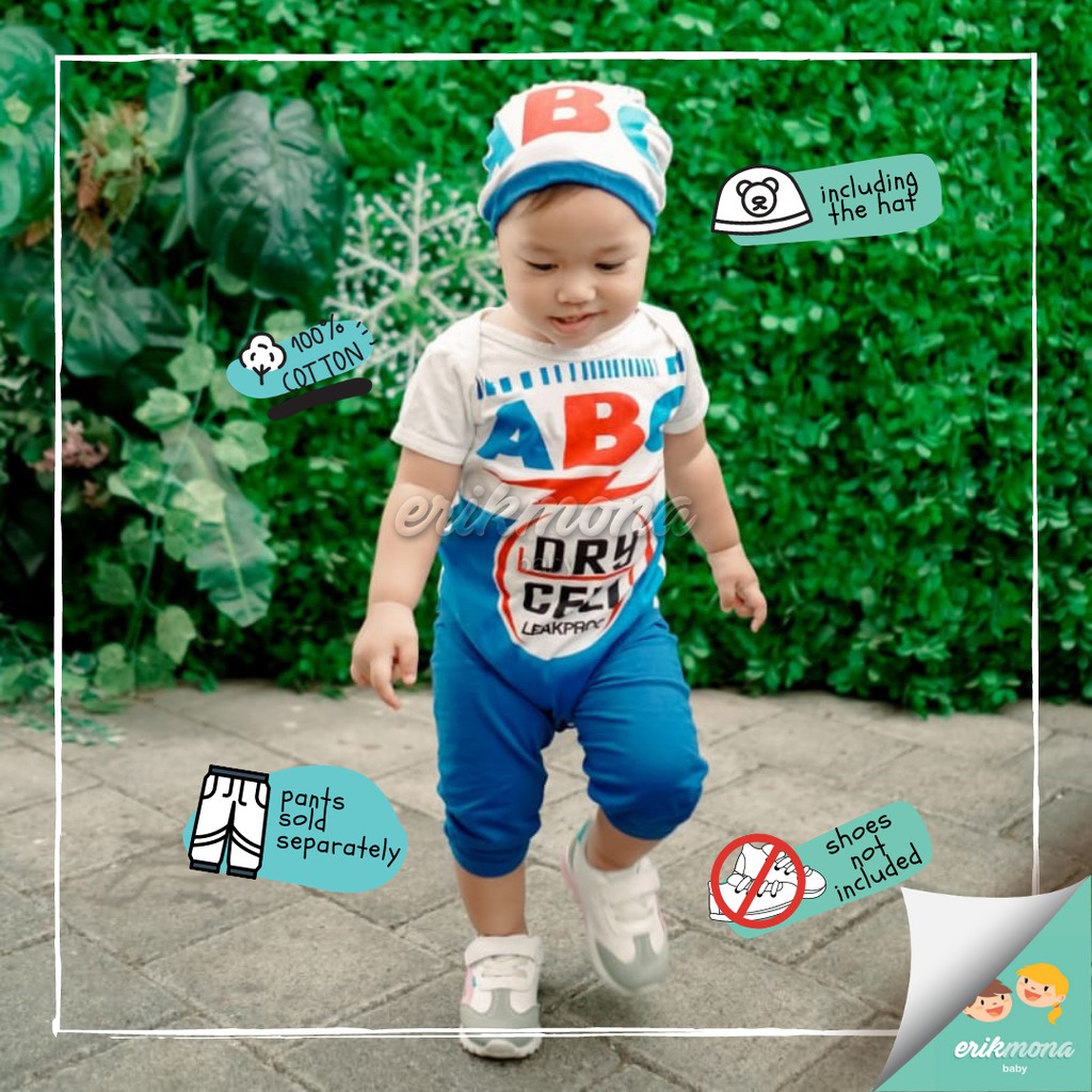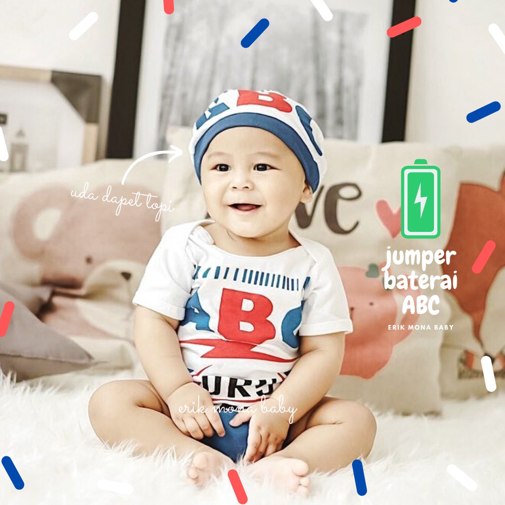 Baju Bayi Laki Laki Jumper Baby Lucu + Topi Karakter Baterai ABC usia 0 - 12 Bulan
