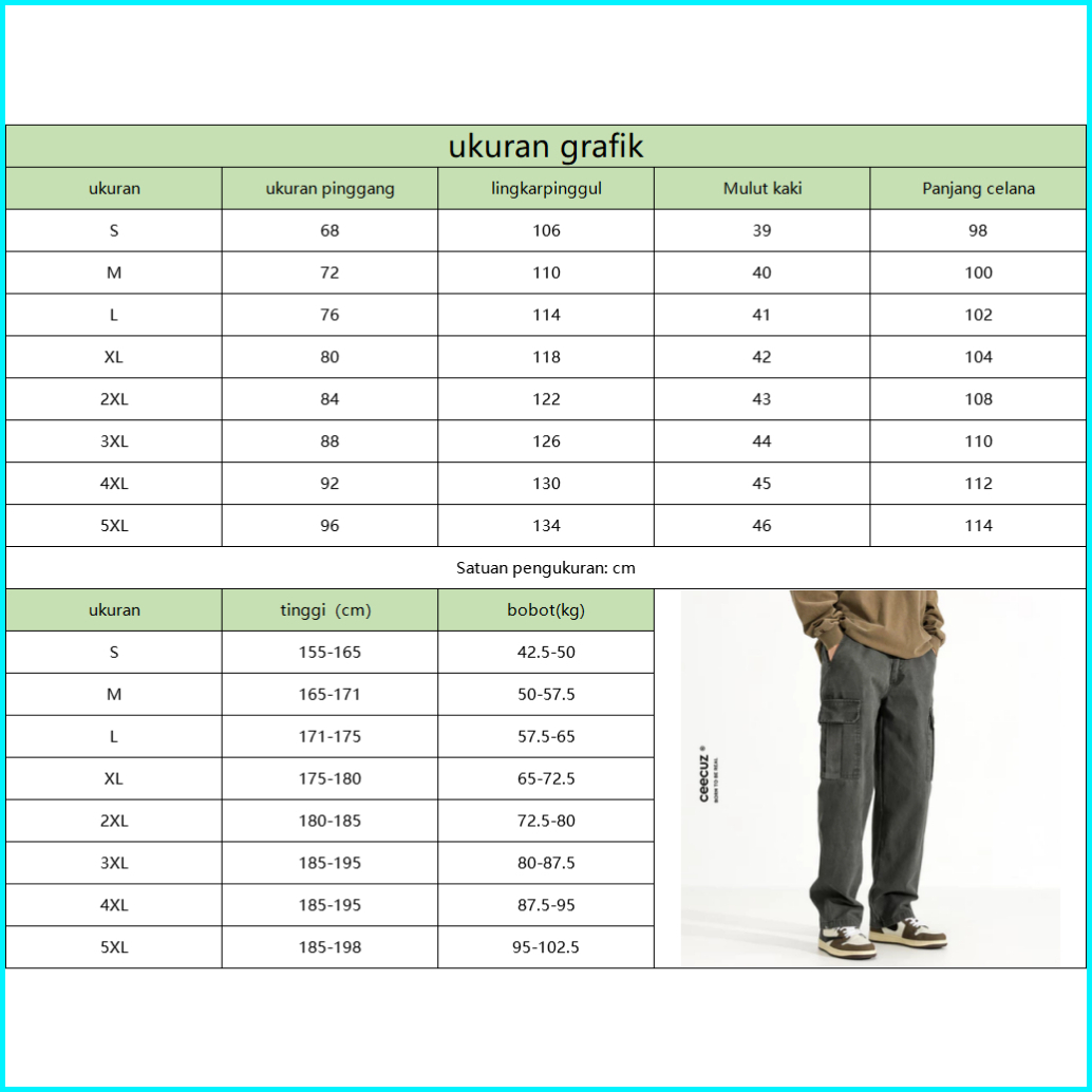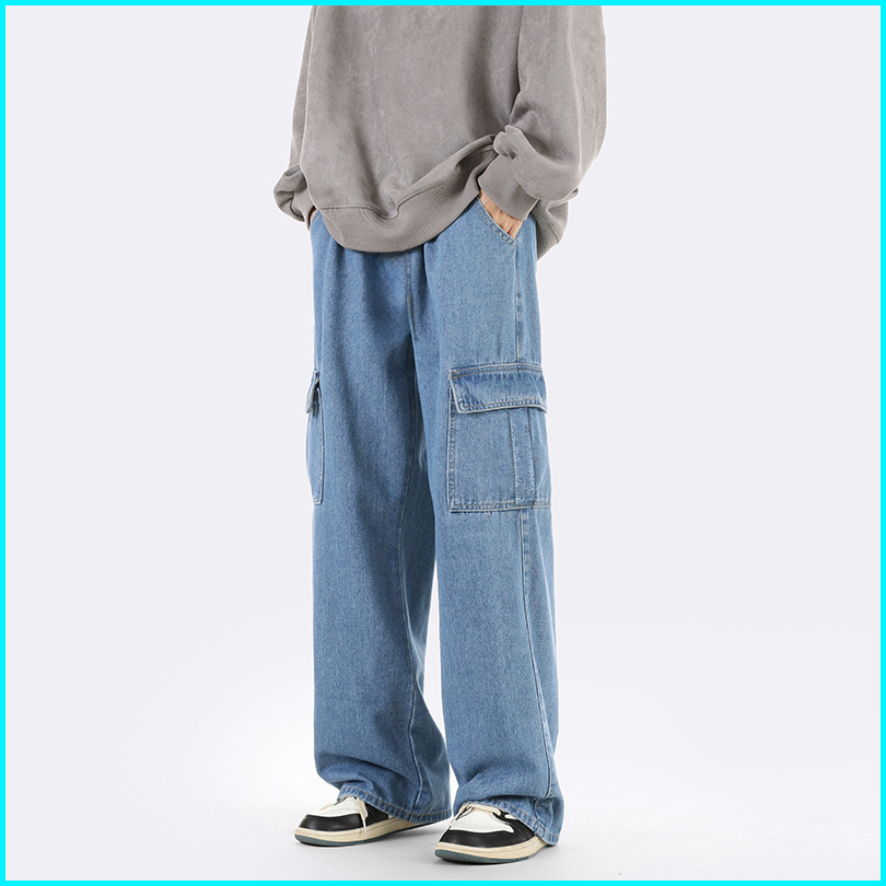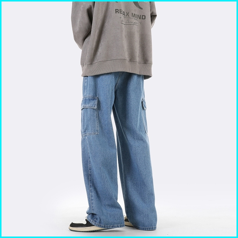 Celana Cargo Baggy Pria Standar Original Hitam Abu Denim Korean Style Cargo Jeans Oversize Cowok Loose Cargo Pants Celan