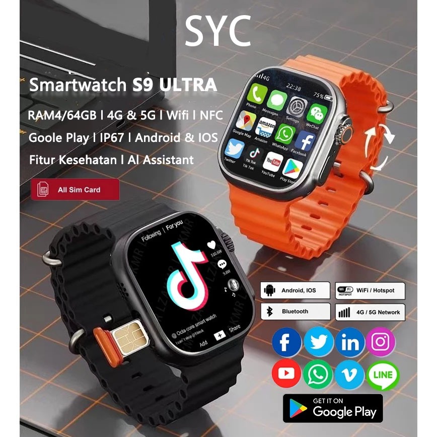 Smartwatch S9 Ultra 4G Sim Card Bluetooth GPS NFC Full Touch Screen Phone Call IP68 Waterproof Wireless Charge Sport Jam Tangan Wanita Smart Watch Pria Jam Tangan Couple
