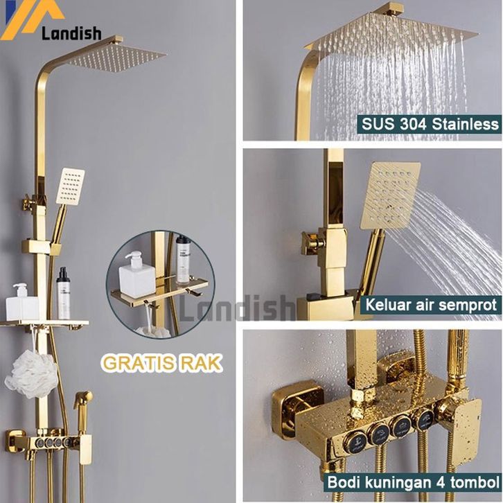 PROMO Shower Kamar 4 in 1set Mandi Persegi Panas-Dingin Dengan Faucet Set pancuran lengkap Kuningan Gold YY ogomnk