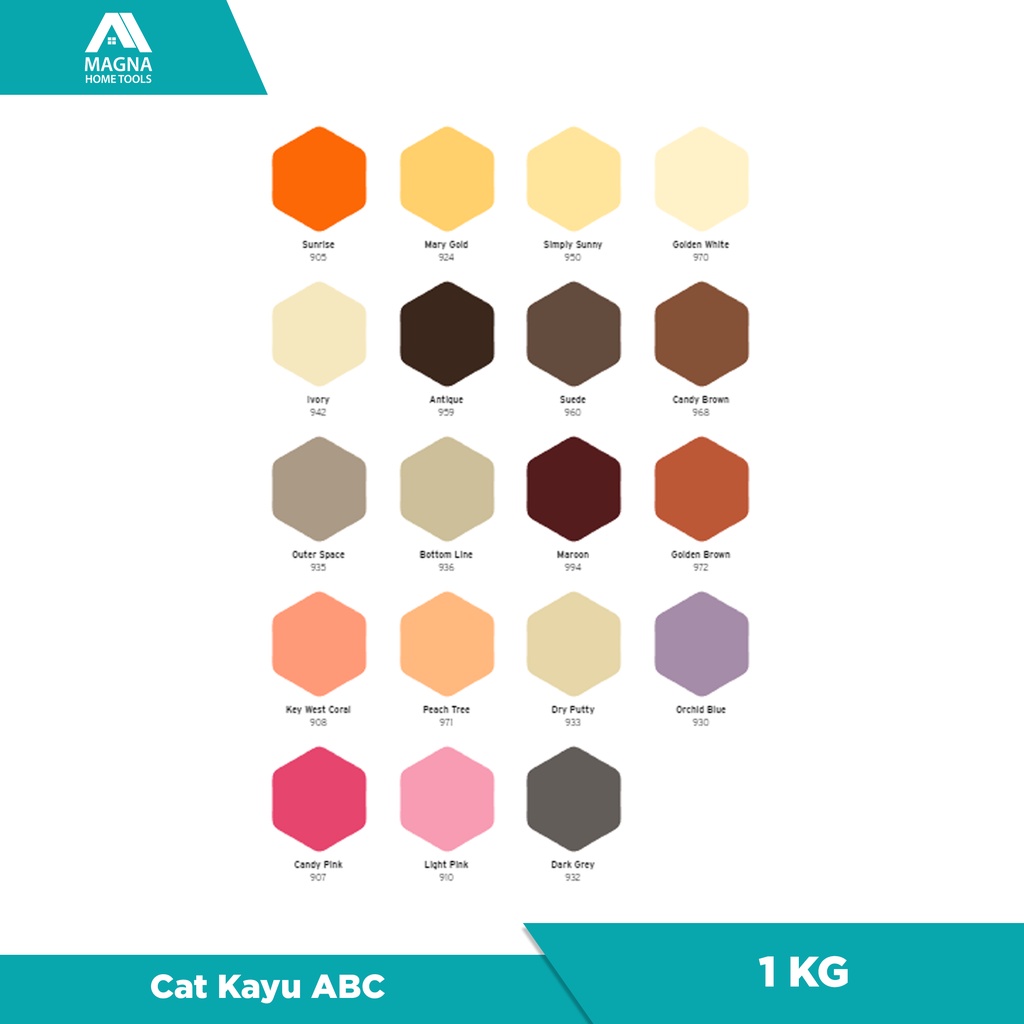 901 PUTIH, 901 PUTIH DOP, 902 HITAM DOP, 902 HITAM, 905 SUNRISE, 907 CANDY PINK, 910 LIGHT PINK, 921 BRIGHT BLUE, 922 GREEN HARBOR, 924 MARY, 925 AMERICA DREAM, 926 ISLAND GREEN, 927 EVERGREEN, 930 ORCHID BLUE, 931 PLATINUM GREY, 932 DARK GREY, 936 BOTTOM LINE, 937 WEDGE WOOD, 938 LAW GREEN, 944 GRASS GREEN, 954 YELLOW, 960 SUEDE, 966 DIAMOND BLUE, 968 CANDY BROWN, 970 EN WHITE, 971 PEACH TREE, 972 EN BROWN, 980 CLEAN GREEN, 990 RED, 992 FLAME ORANGE, 994 MAROON