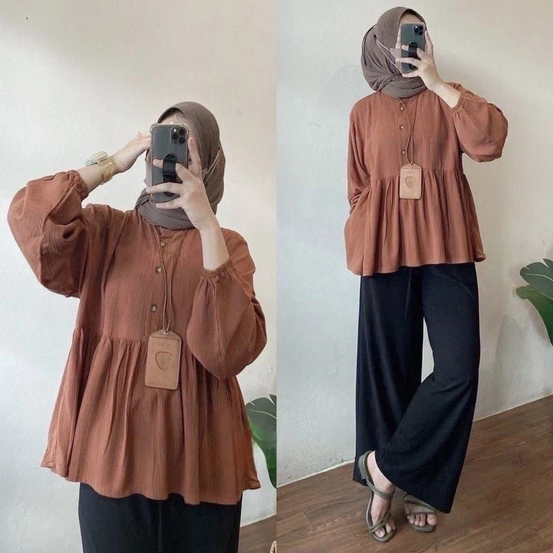 Atasan Wanita Kekinian Raisa Rayon Crinkle Rania Series Premium Blouse Wanita Motif Polos Lengan Panjang Best Seller