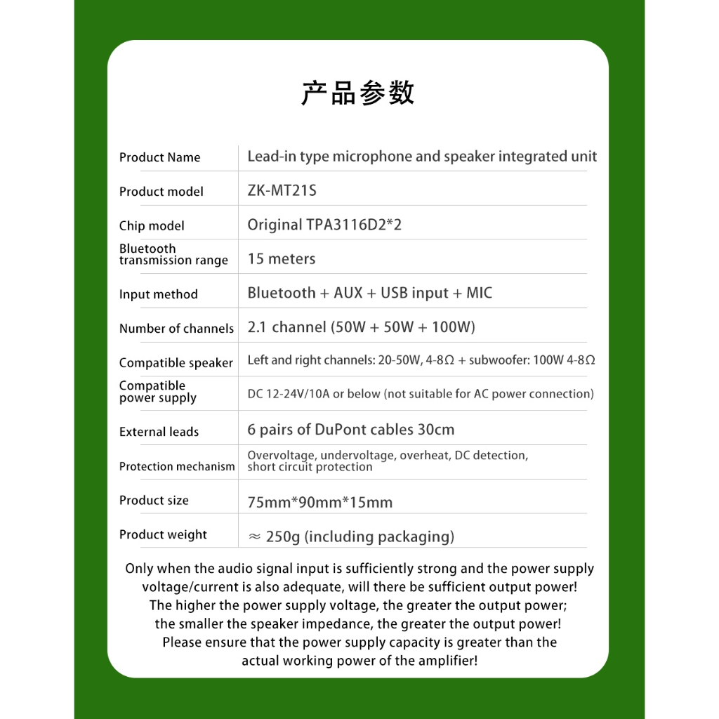 Wuzhi Audio | ZK-MT21S Amplifier 2.1 CH Bluetooth + AUX + USB input + MIC 50W + 50W + 100W TPA3116D22