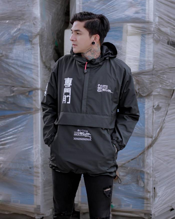 JAKET PARASUT PRIA WANITA UNISEX KANJI WATERPROOF CAGOULE WINDBREAKER ORIGINAL DISTRO THE BOJIEL - HITAM, M
