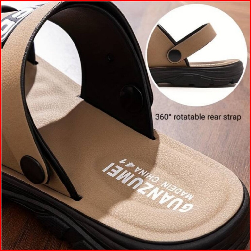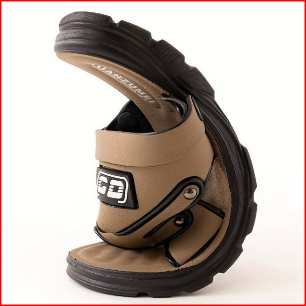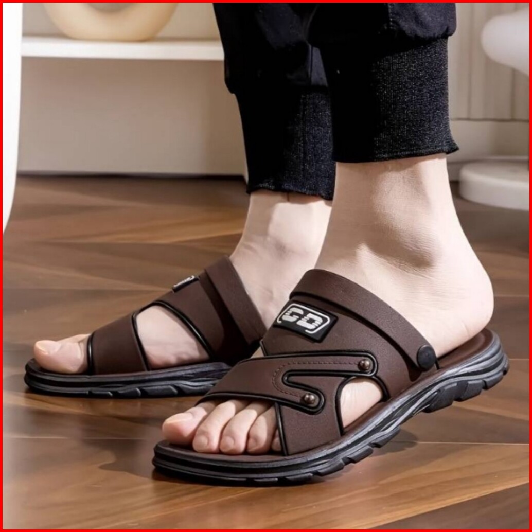 Sandal Pria Bahan Kulit Sintetis Premium Warna Cokelat Cream Abu Sendal Slop Kasual Led
