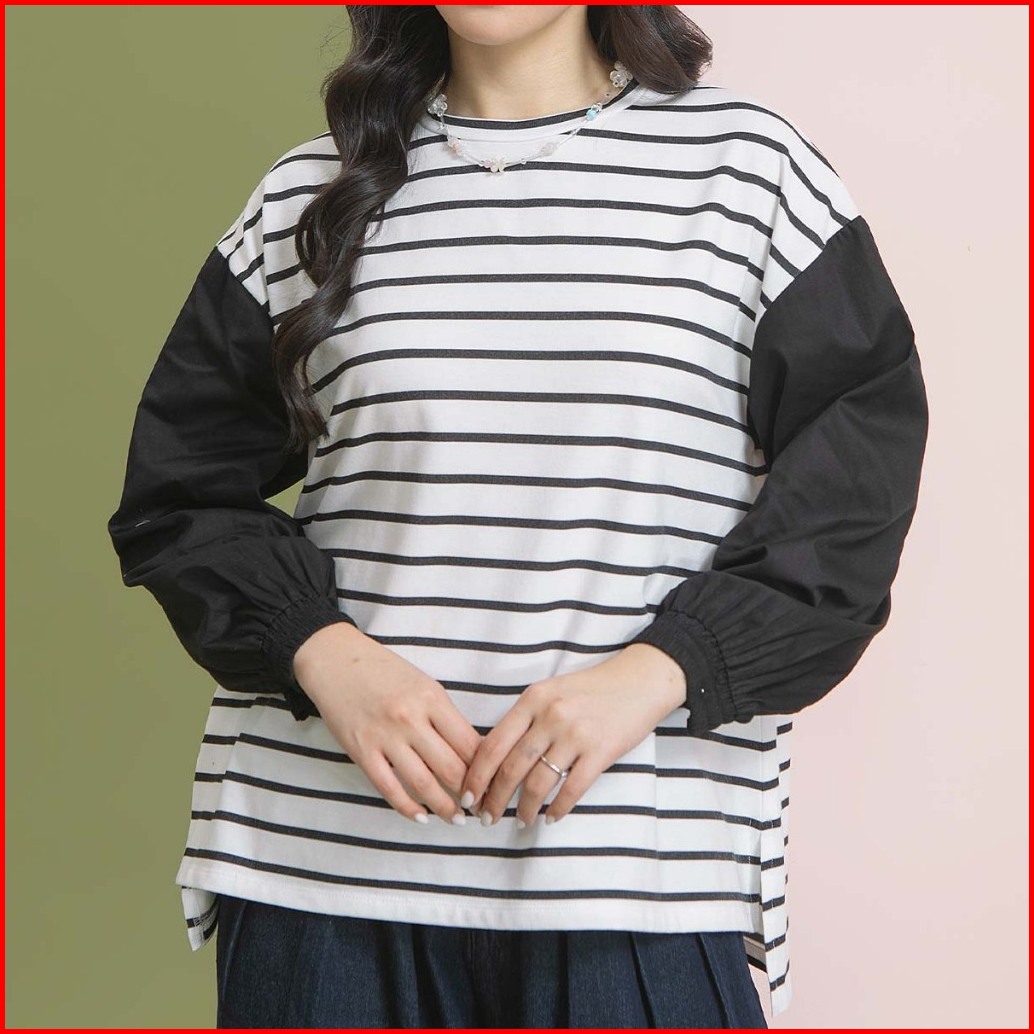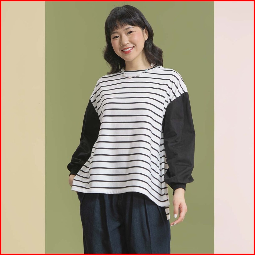 Hijabchic Safiya Broken White Stripe Top - Kaos Combed Garis Lengan Balon Simple