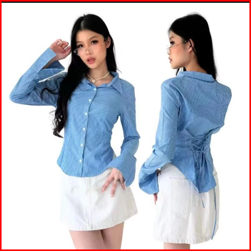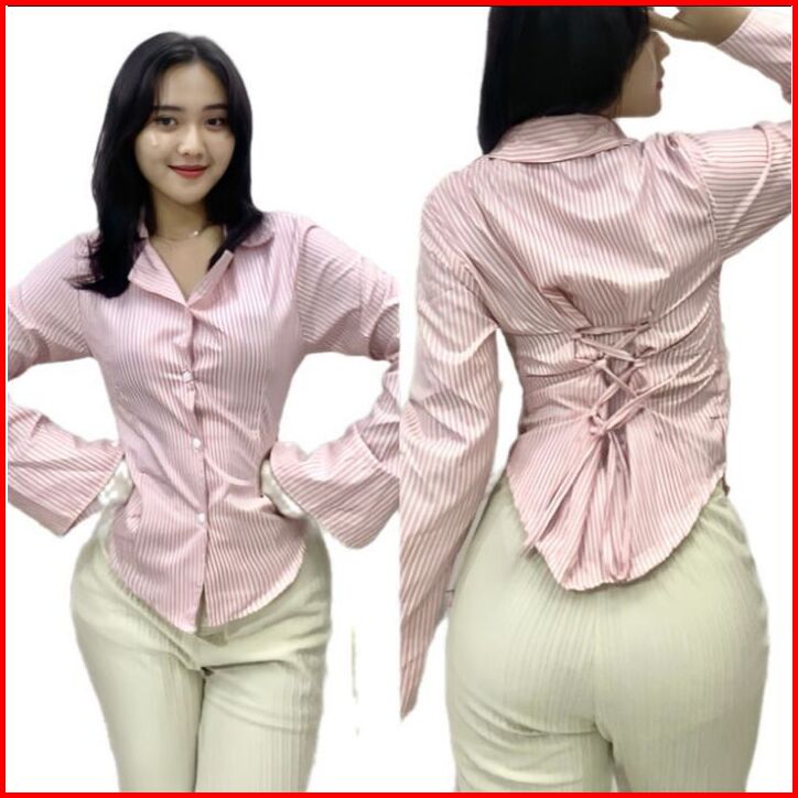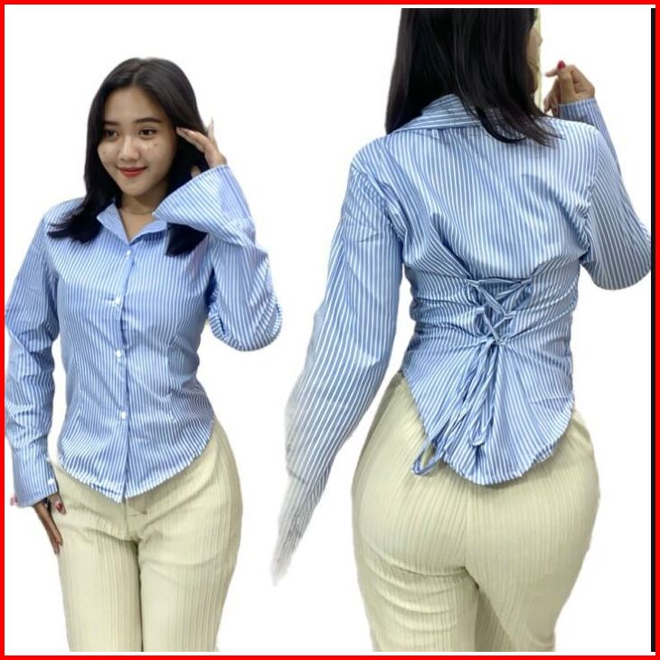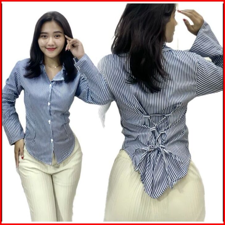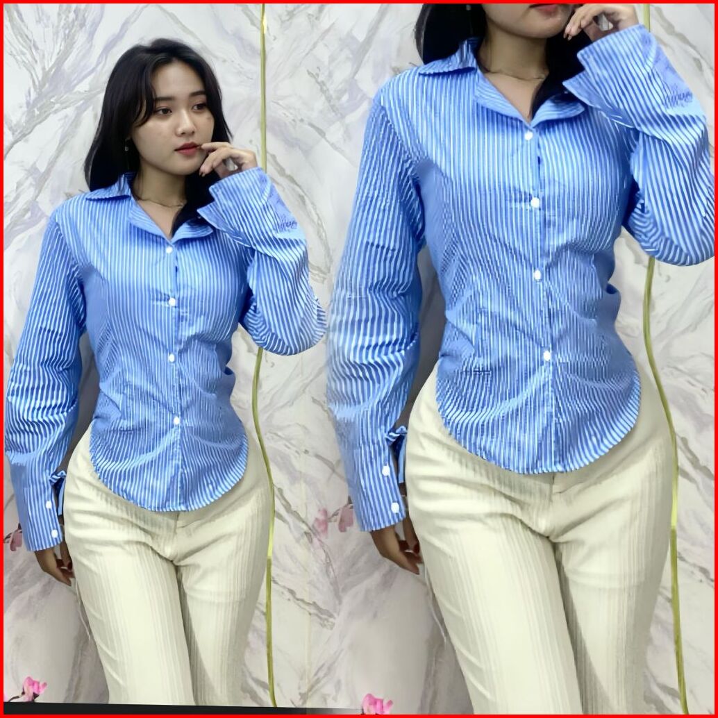 Shasa Fitted Shirt Atasan Kemeja Wanita Katun Salur Mikro