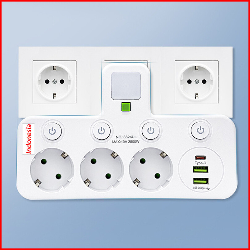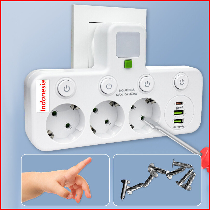 Stop Kontak Multiguna Lamp Led 5 Port Usb Type C - 2500w Tahan Api Steeker Eu Original