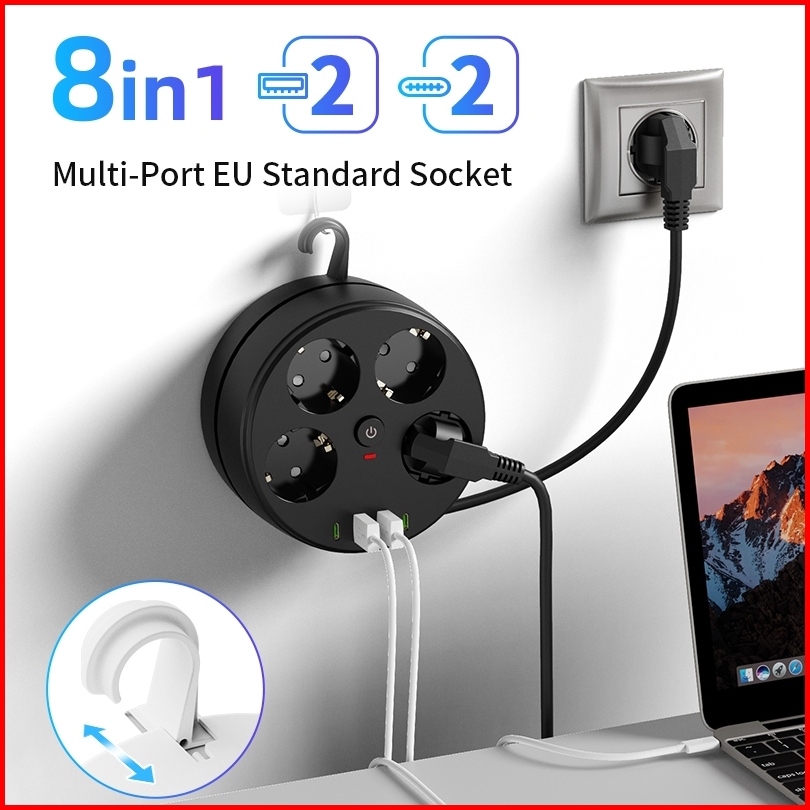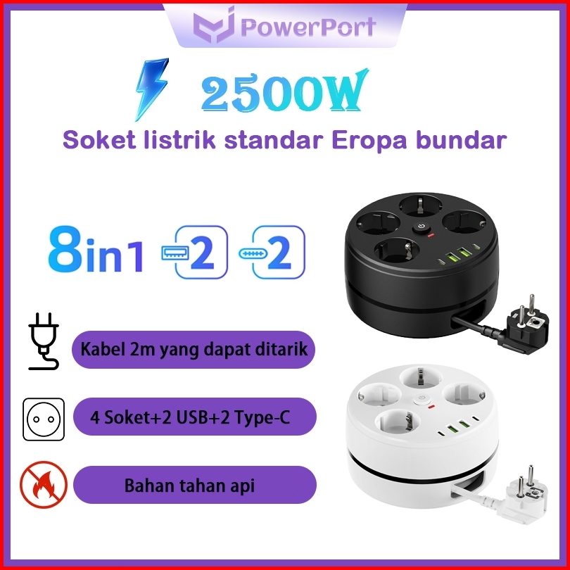 Powerport 2500w Soket Standar Eropa 8 In 1 Power Strip Power Socket Stop Kontak 4colokan 2usb 2type-c Usb Charger Panjan