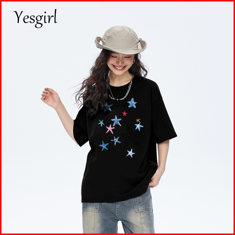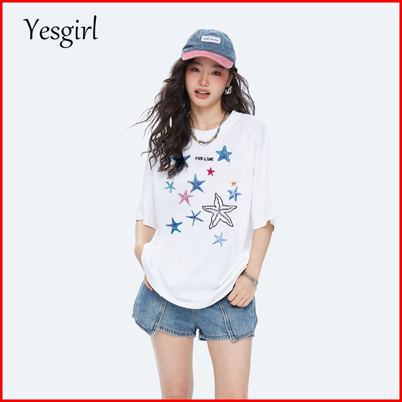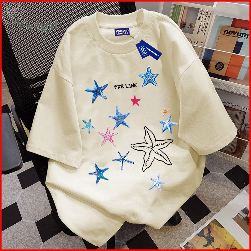 Yesgirl Korea Style Fdr Line Bintang Laut Print Kaos Kasual Longgar Kaos Oversize Wanita Fashion Korean Style Baju Kaos