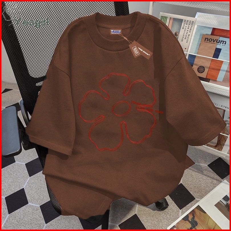 Yesgirl Korea Style Red Sketch Flower Print Kaos Kasual Longgar Kaos Oversize Wanita Fashion Korean Style Baju Kaos Over