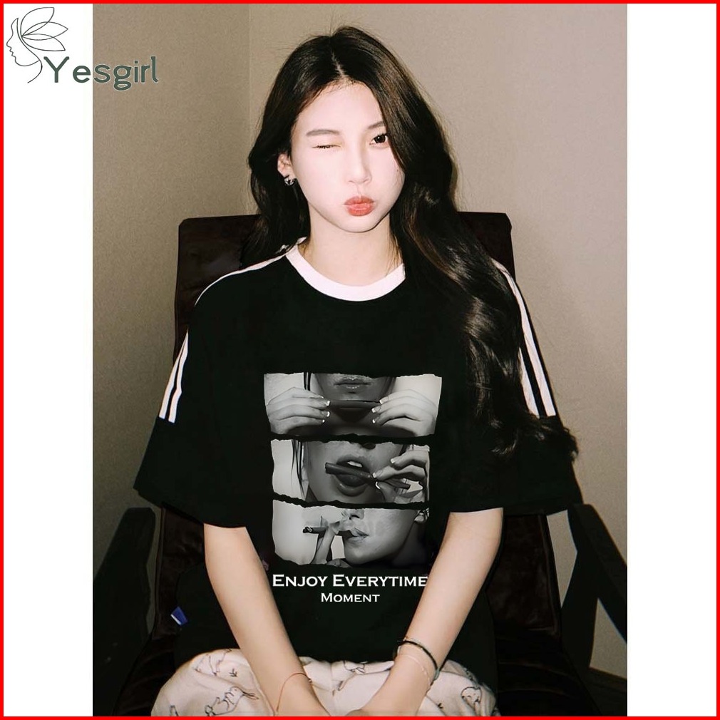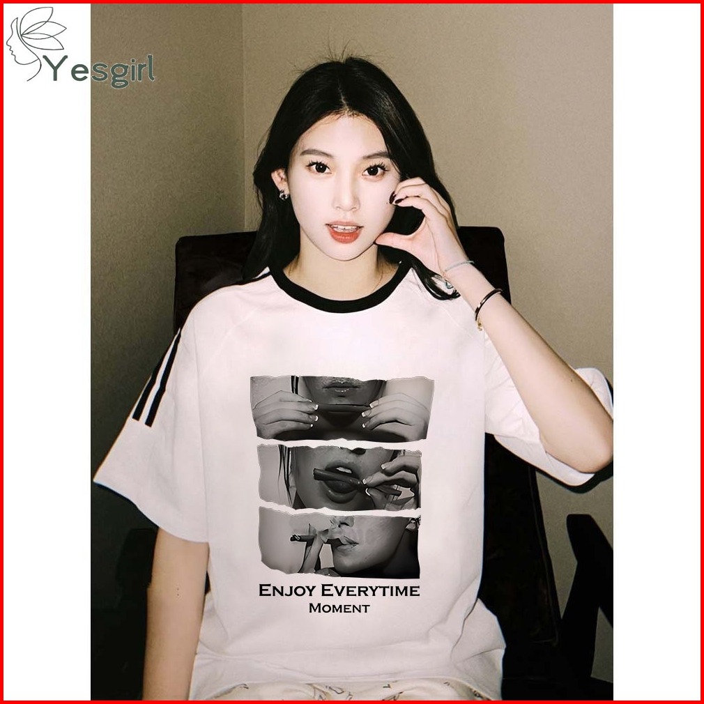 Yesgirl Baju Wanita Putih Black Kaos Premium Lengan Pendek Oversize Kaos Motif Enjoy Everytime Moment Atasan Wanita Keki