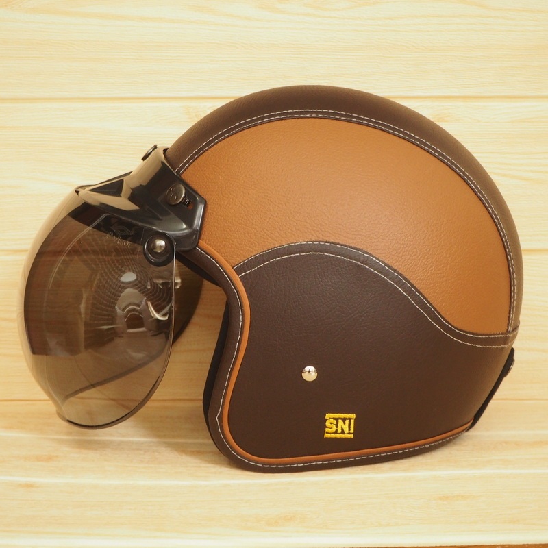 BOGO HELM BOGGO CLASSIC GLOSSY SNI DEWASA PRIA DAN WANITA HELMET RETRO KLASIK LEATHER SINTETIS KACA DATAR CEMBUNG WARNA COKLAT MUDATUA