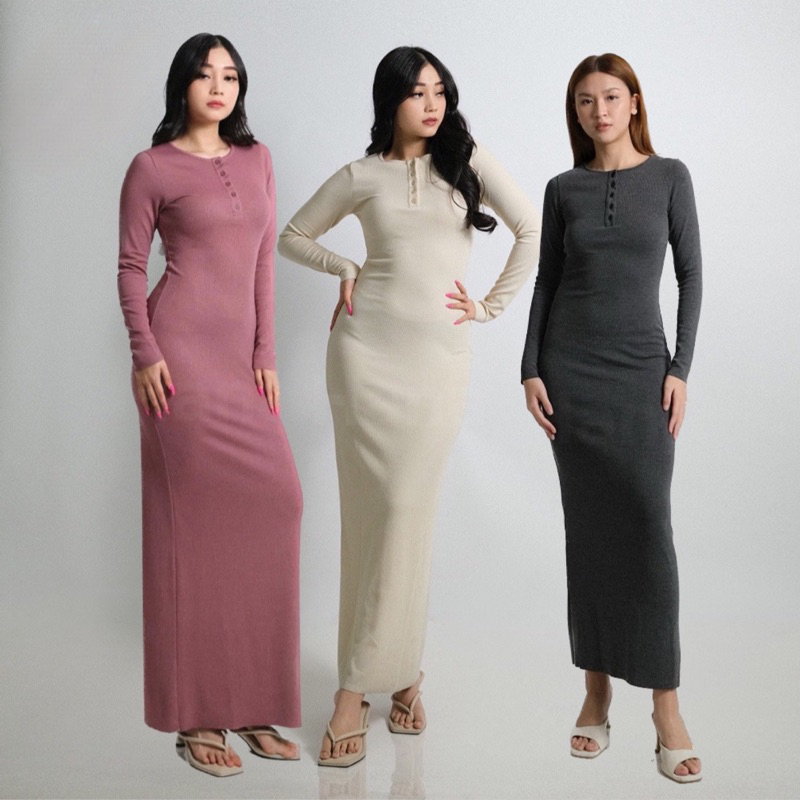 TERLARIS Dress Arisha Arisha Casual Long Dress Wanita Knit Kancing Korean Style Dress press bodycon Dress pantai KNIT RIB