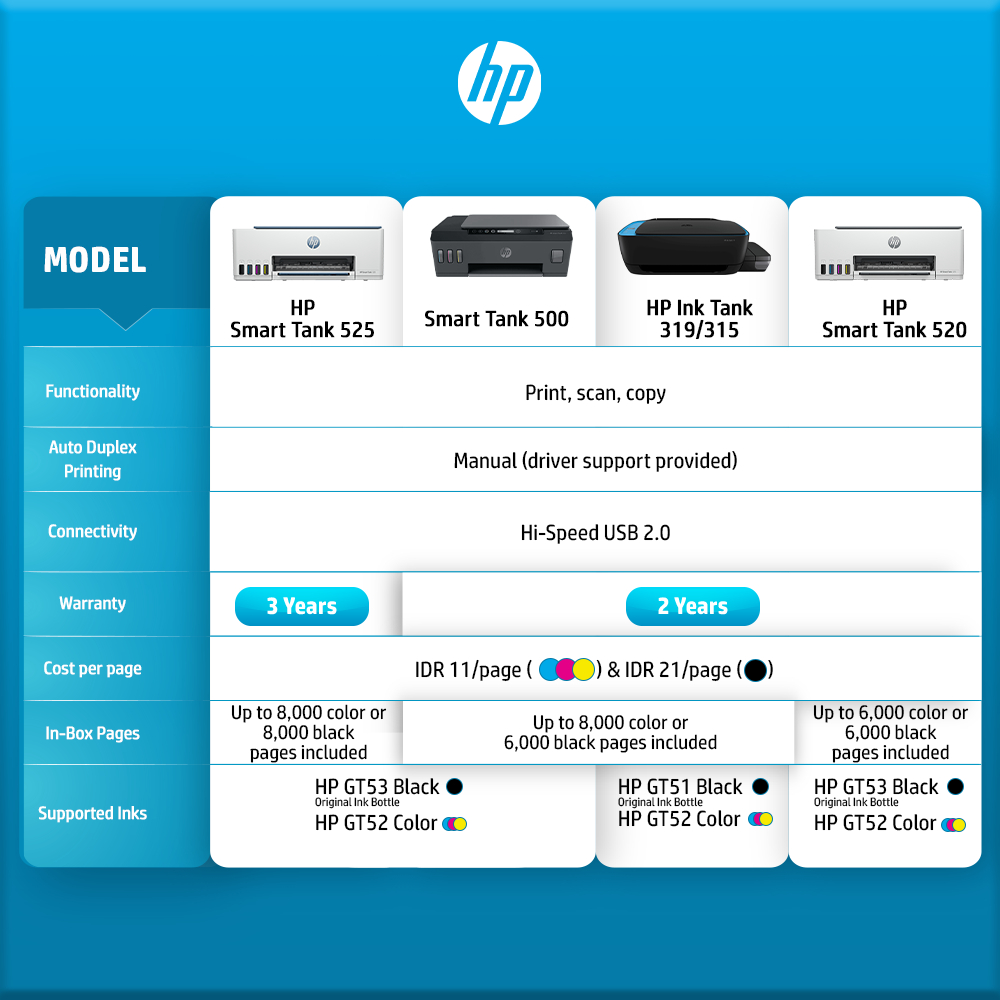 Printer HP Smart Ink Tank 525 / 520 / 580 All in One Print Scan Copy USB Fotocopy Color Colour Warna