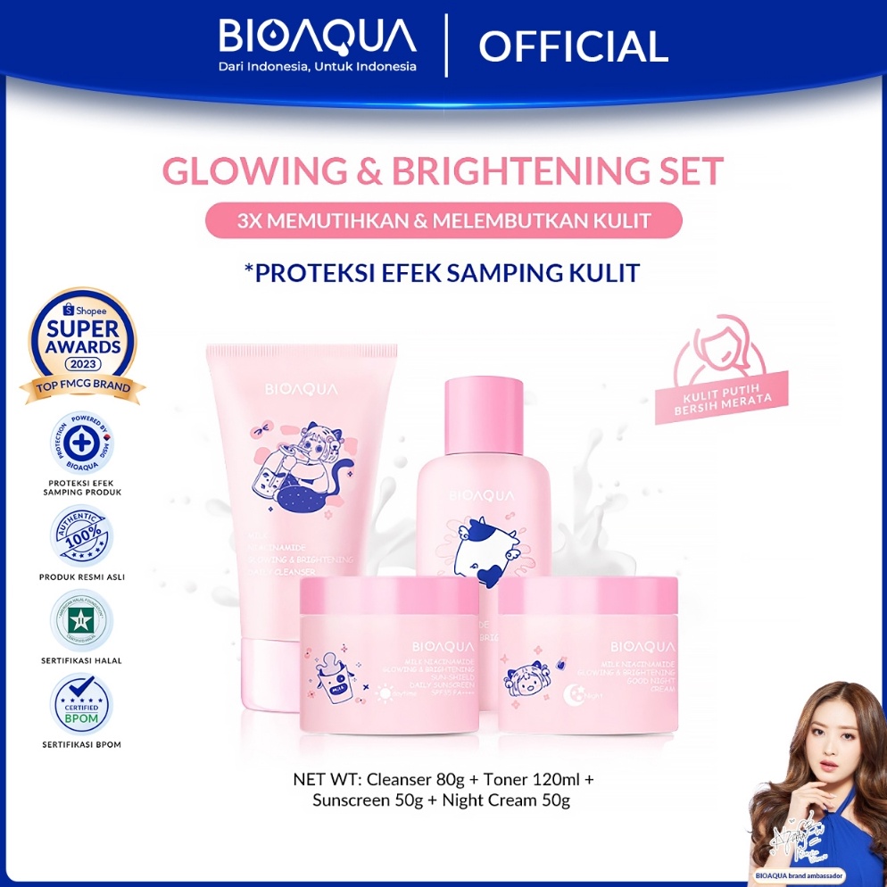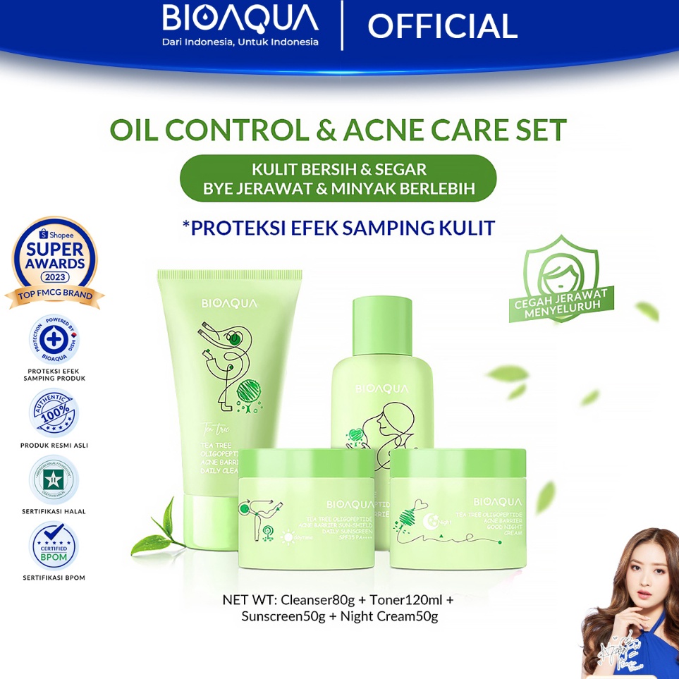 Terkini Grosir BIOAQUA Skincare Anak Paket 4pcs Niacinamide Glowing Brightening Tea Tree Oligopeptide Acne Set With Cleanser Toner Sunscreen Night Cream