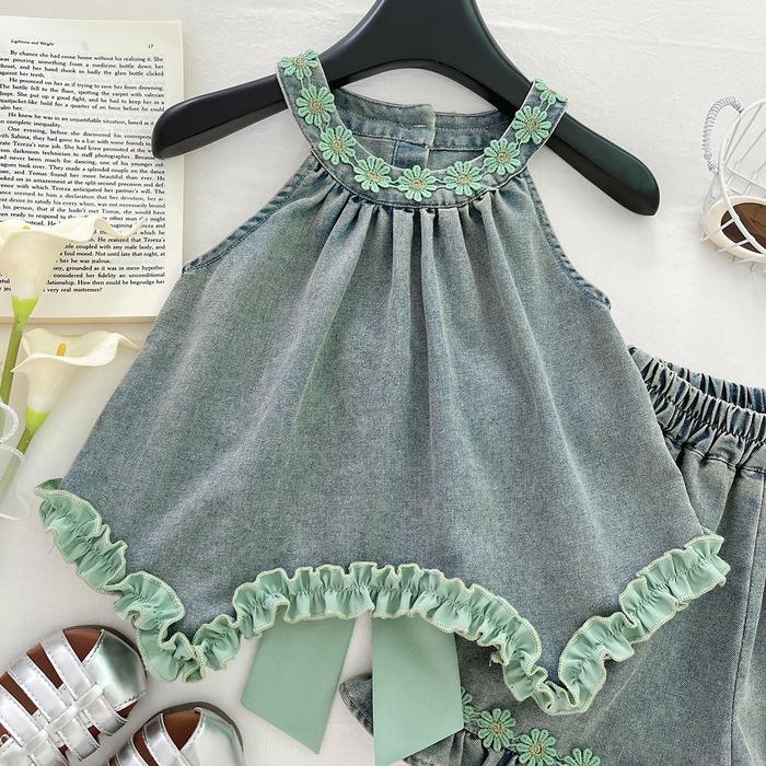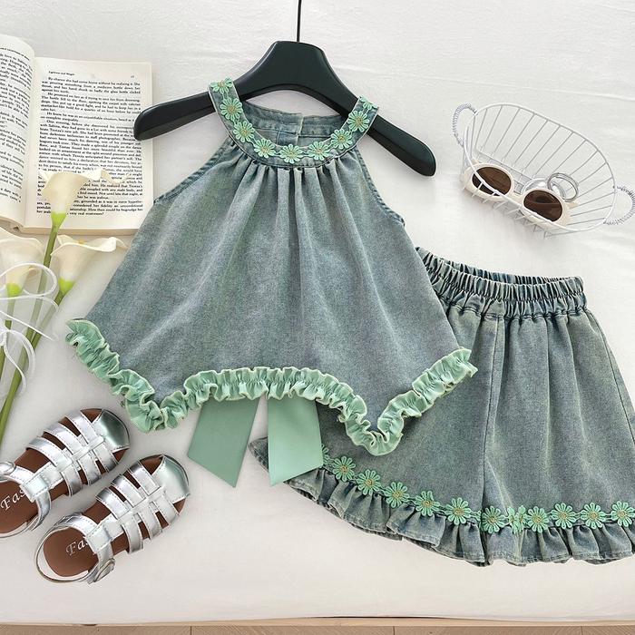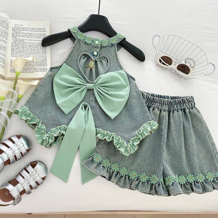 Ryuta Setelan Denim Pita Anak Perempuan 1-10 Tahun - Hijau, 90