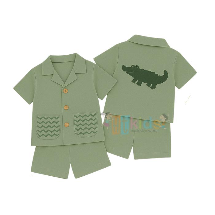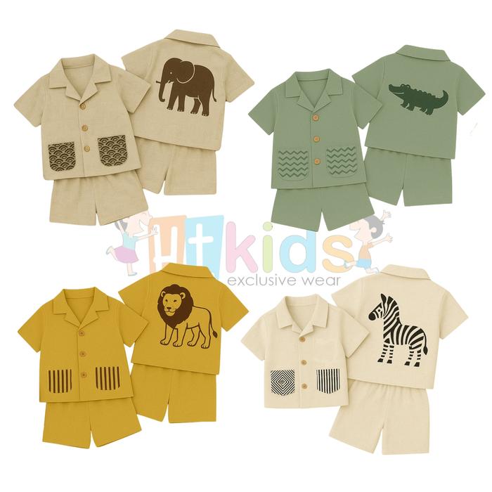 Htkids Baju Setelan Safari Anak – Motif Binatang Lucu Zebra, Singa, Gajah, Buaya St14 1 - 6 Tahun - St14 Sage Buaya, Siz