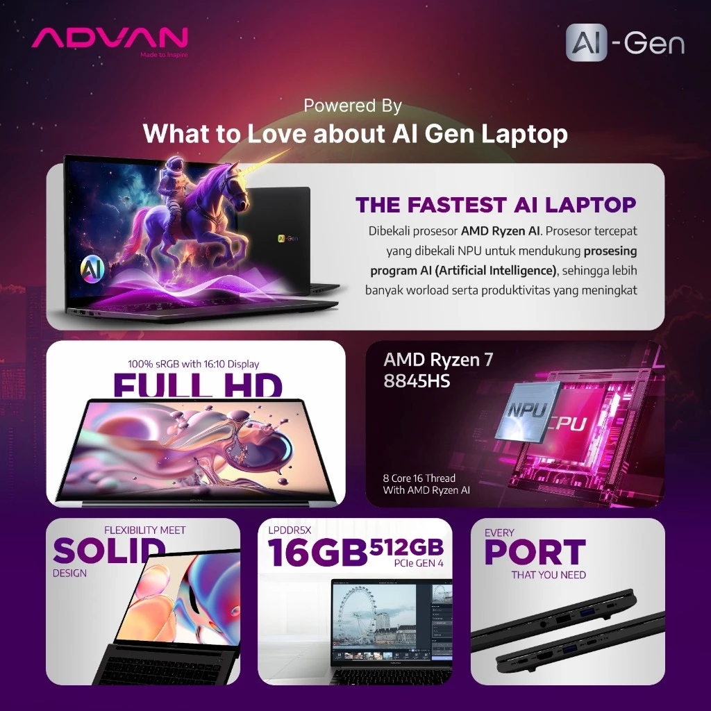 ADVAN AI GEN Amd Ryzen 7 8845HS RAM32GB SSD2TB 14'' Ips Windows 11