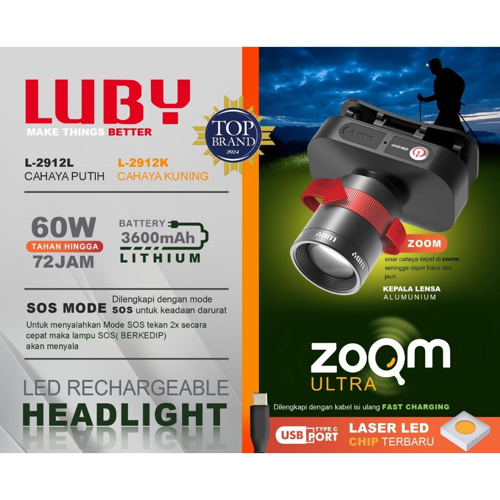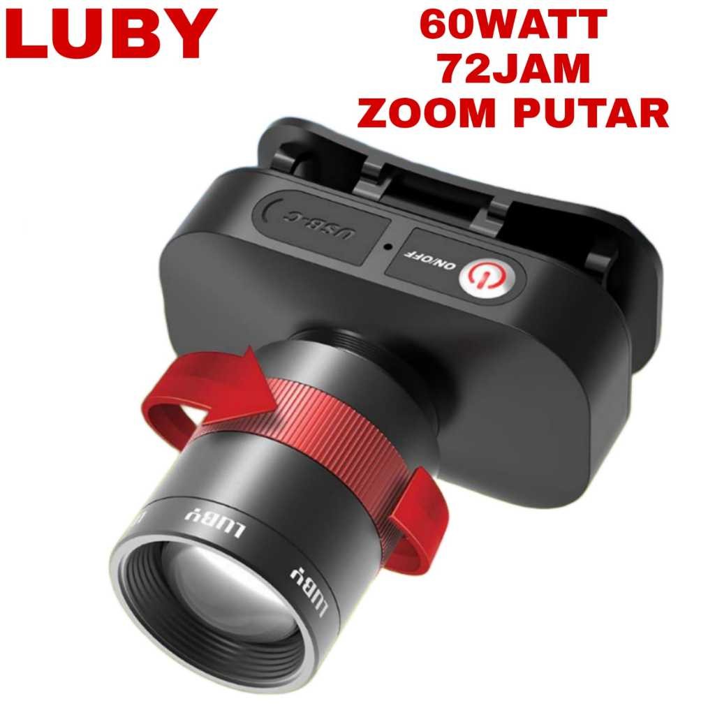 SENTER KEPALA LED LUBY L-2912L 60WATT TAHAN HINGGA 72JAM - ZOOM PUTAR - BAHAN ALMUNIUM - CAHAYA TERANG - USB TYPE C
