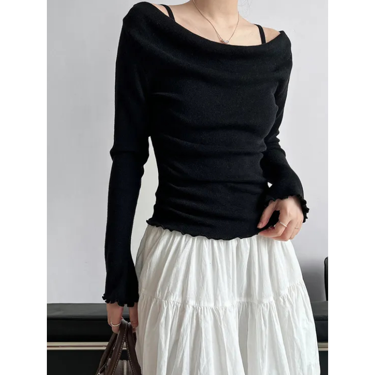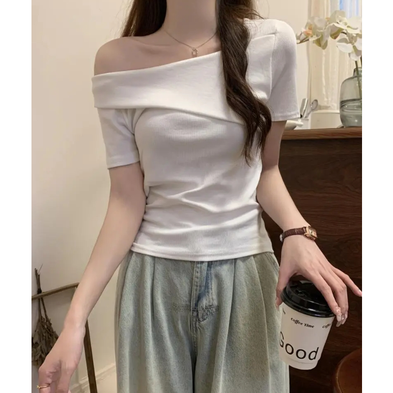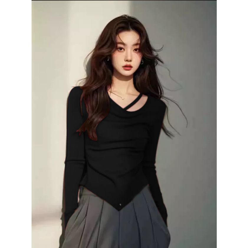 EMITA BLOOM Baju kaos crop top wanita kekinian lengan panjang korean style import crop top long sleeve one shoulder kore