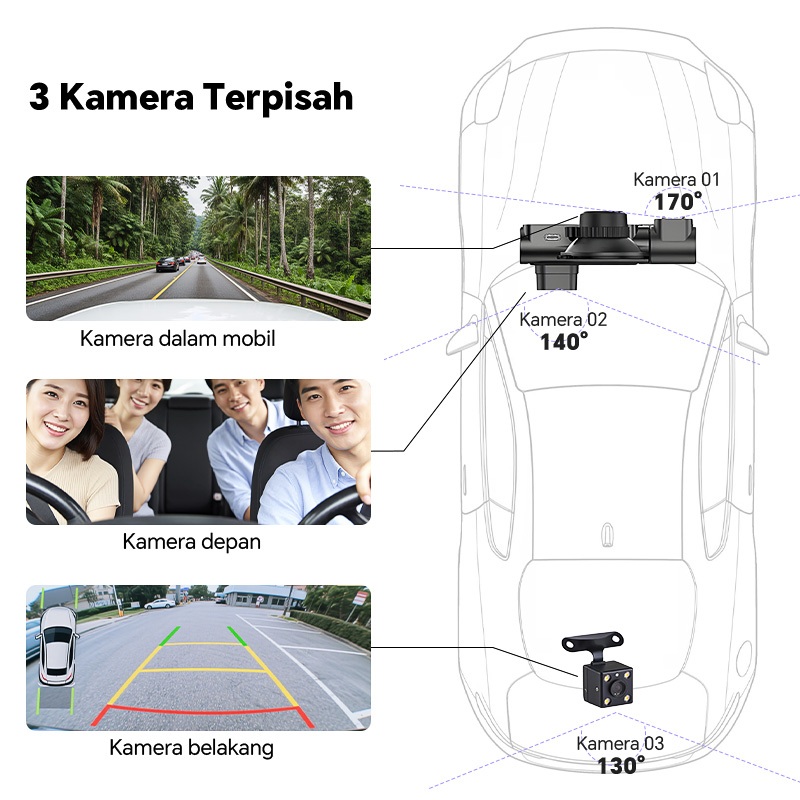 3Lensa Dasbor Mobil 1920P HD Lensa Tiga Layar Sentuh Loop Penglihatan Malam Sensor Gravitasi Video Kamera Mobil Dashcam