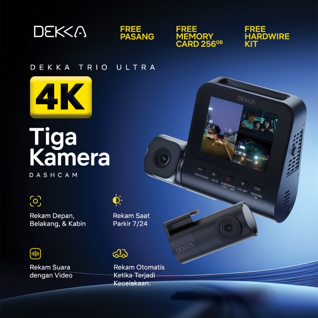 DEKKA DK50 Dashcam Mobil 4K 3 Kamera Depan Belakang Kabin Sony Starvis 2 Wifi 6 GPS Gratis Pasang