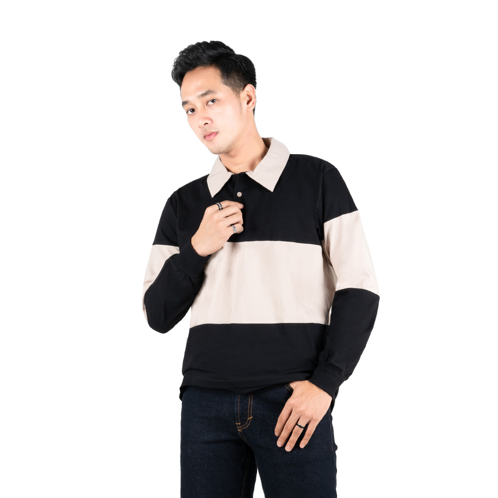 Otsky Kaos Pria Rugby Long Striped Cotton Combed 24s Polo Katun 2(O)
