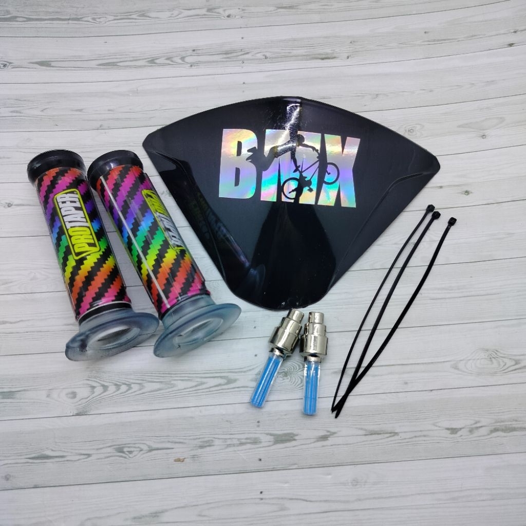 paket sepedah bmx visor mx old+hangrip pelangi+ tutup pentil nyala free tali ties dan stiker bmx hologram