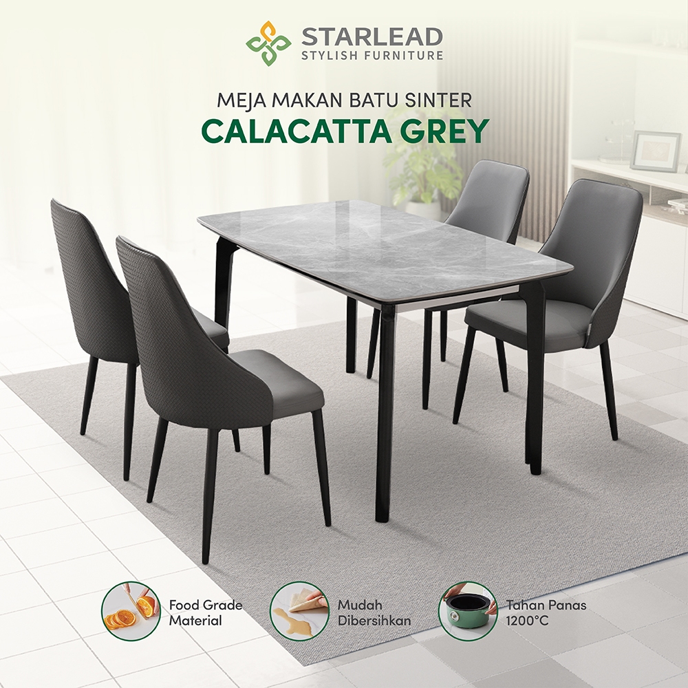 STARLEAD SET MEJA MAKAN BATU SINTER / MEJA MAKAN KAKI KAYU / SINTERED STONE DINING TABLE - CARRARA WHITE / CALLACATA GREY