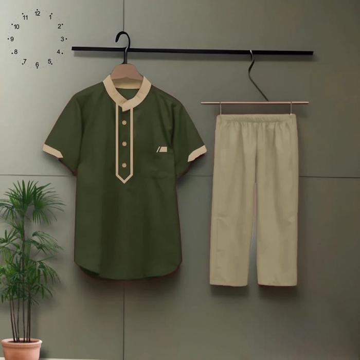 BAJU KOKO ANAK LAKI-LAKI MODEL PAKISTAN TERBARU 2021 DENGAN BONUS PECI DAN BAJU SETELAN - PANJANG - CREM CELANA HIJAU, 1 THN