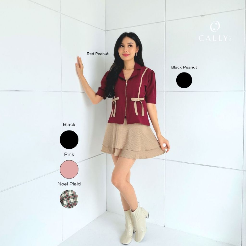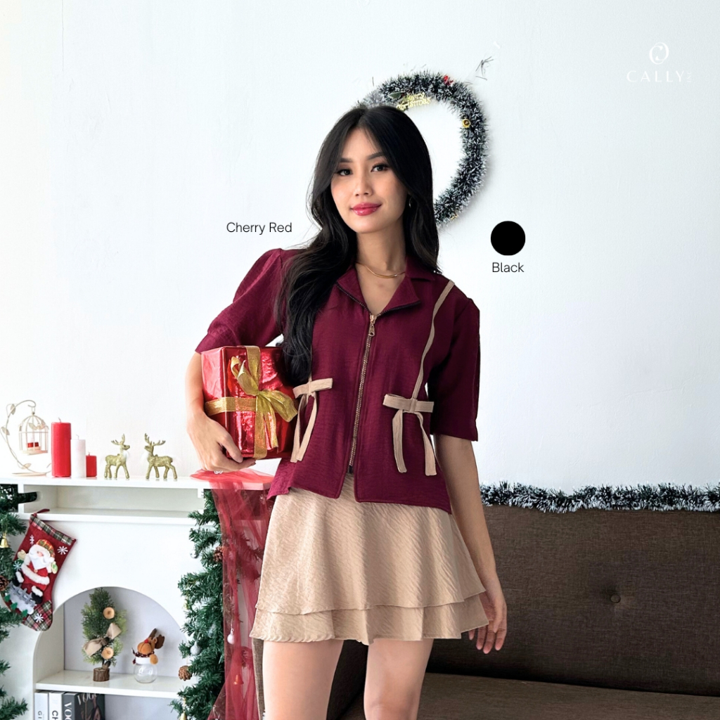 Kemeja Zipper Wanita Korean Style Baju Natal Merah Maroon Blouse Resleting Depan Christmas Outfit Red Hitam Black Size S