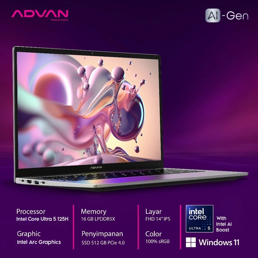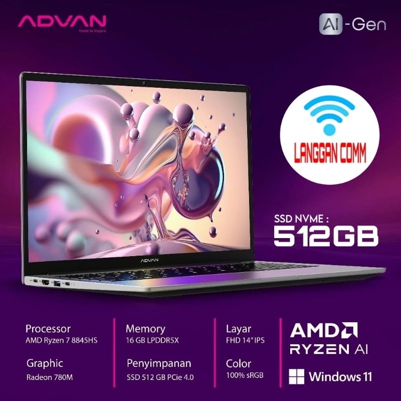 Laptop Advan Ai Gen AMD Ryzen 7 8845HS Ai With NPU AMD Ryzen Ai Ram 16GB SSD 512GB Windows 11 Laptop Advan Ai Gen Notebook Advan Ai Gen