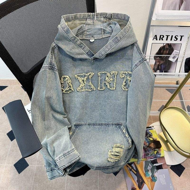Hooded ripped hoodie 2025 men's American washed old denim hoodie trendy brand loose casual jacket