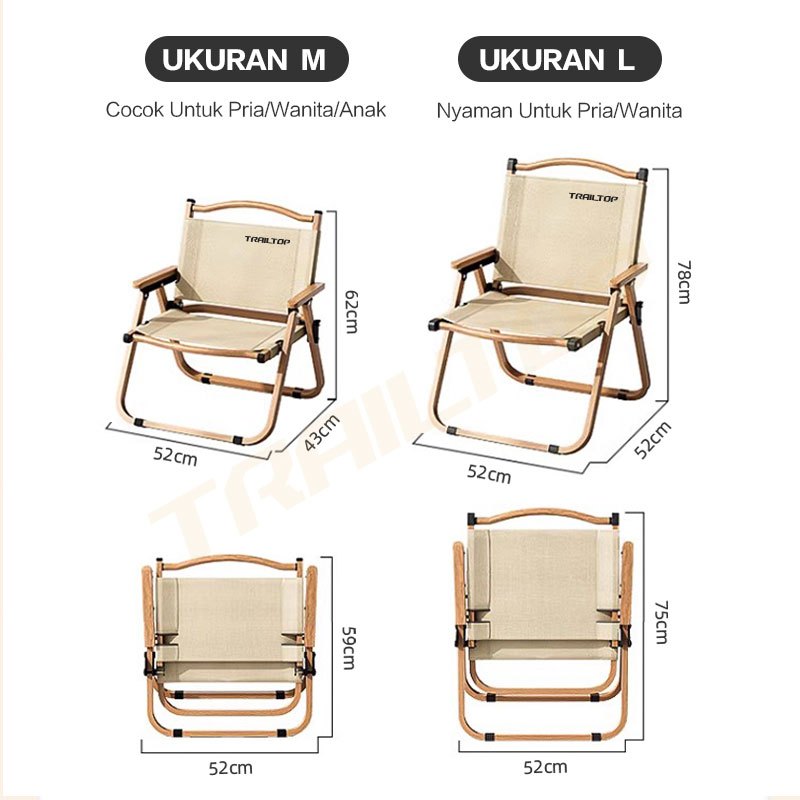 TRAILTOP KURSI LIPAT OUTDOOR DENGAN GAGANG KAYU KURSI PANTAI LIPAT UNTUK CAMPING BERBEBAN 150KG