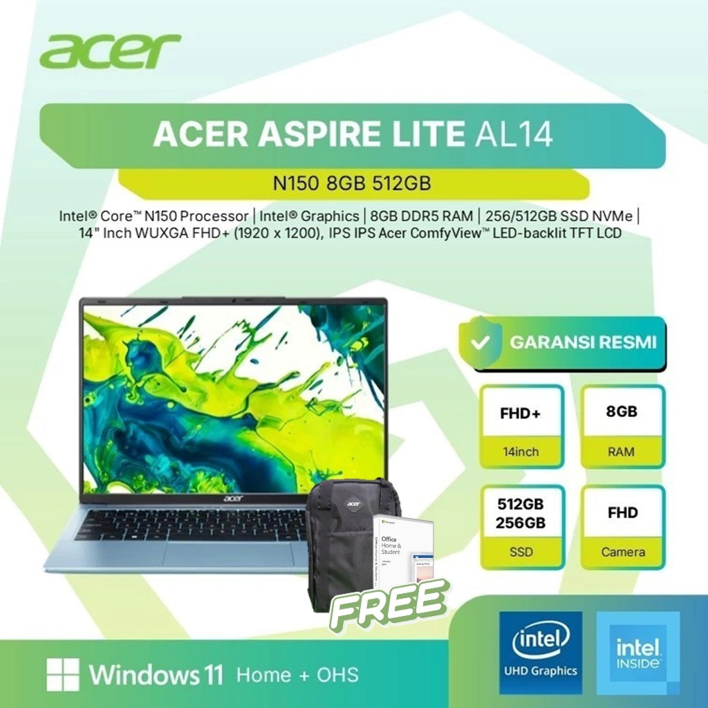ACER LAPTOP ASPIRE LITE AL14-32P-C8PX INTEL N150 RAM 8GB STORAGE 256GB/512GB SSD WIN 11 +OFFICE 14" WUXGA AL14-32P-C6CC AL14-37P-C18U