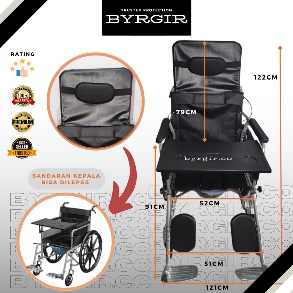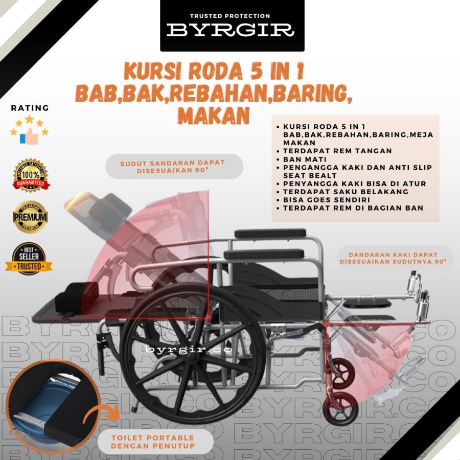 BYRGIR Kursi Roda Lipat Wheelchair 5in1 Multi fungsi BAB Toilet Meja Makan Travel Travelling Lansia Selonjor Rebahan Bar