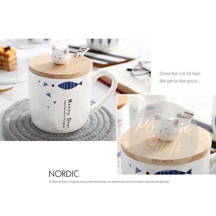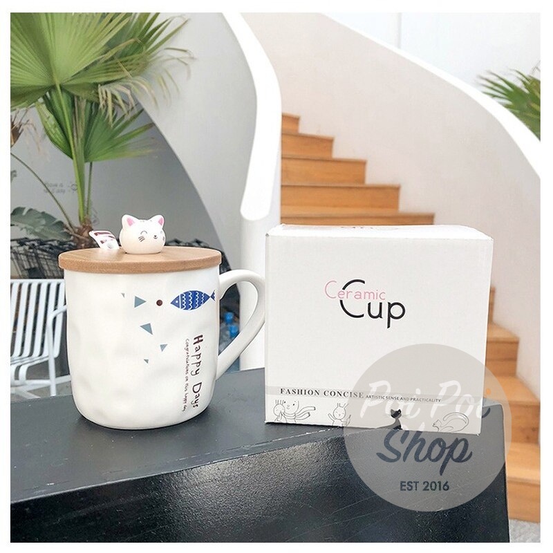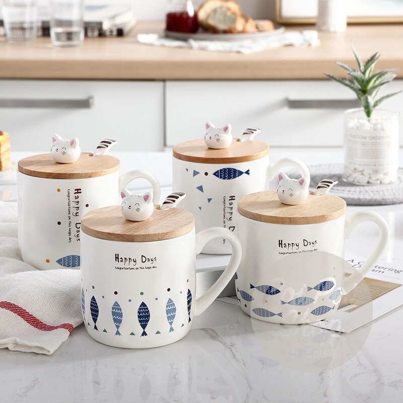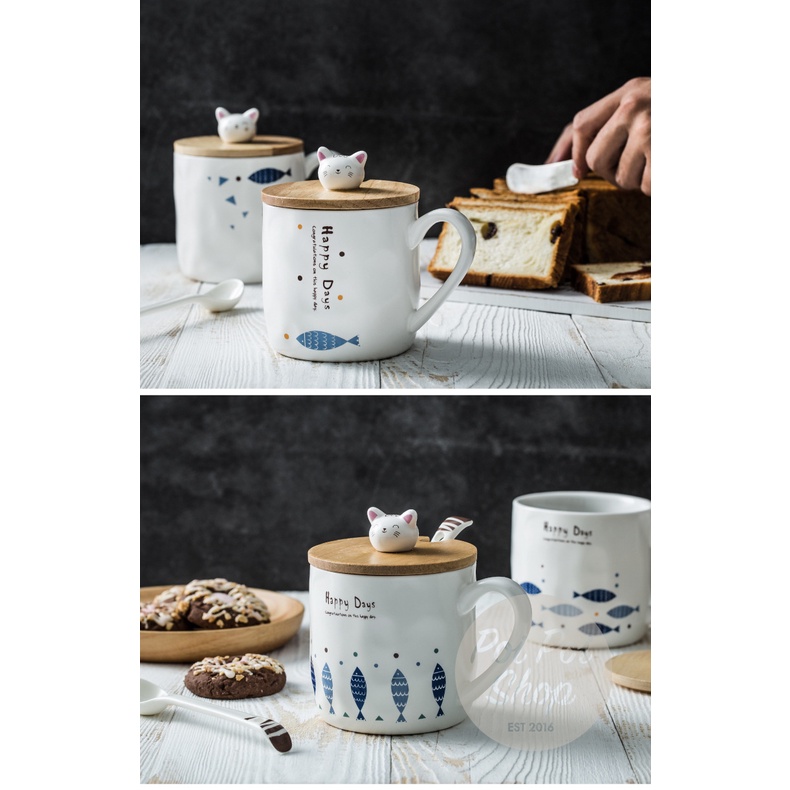 Cangkir Keramik Cats Happy Day Cup Gift Set Ceramic Mug 380 ml Gelas dengan sendok dan tutup High Quality