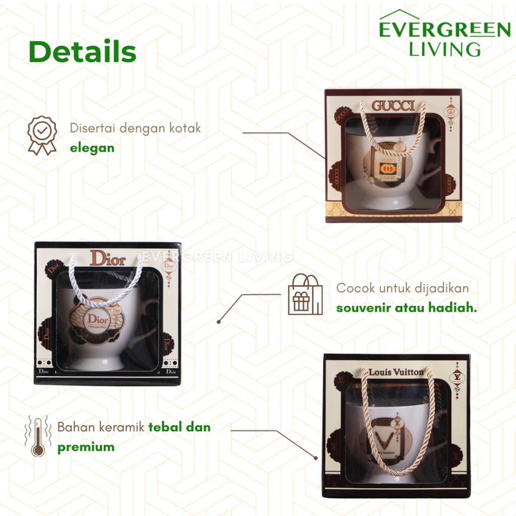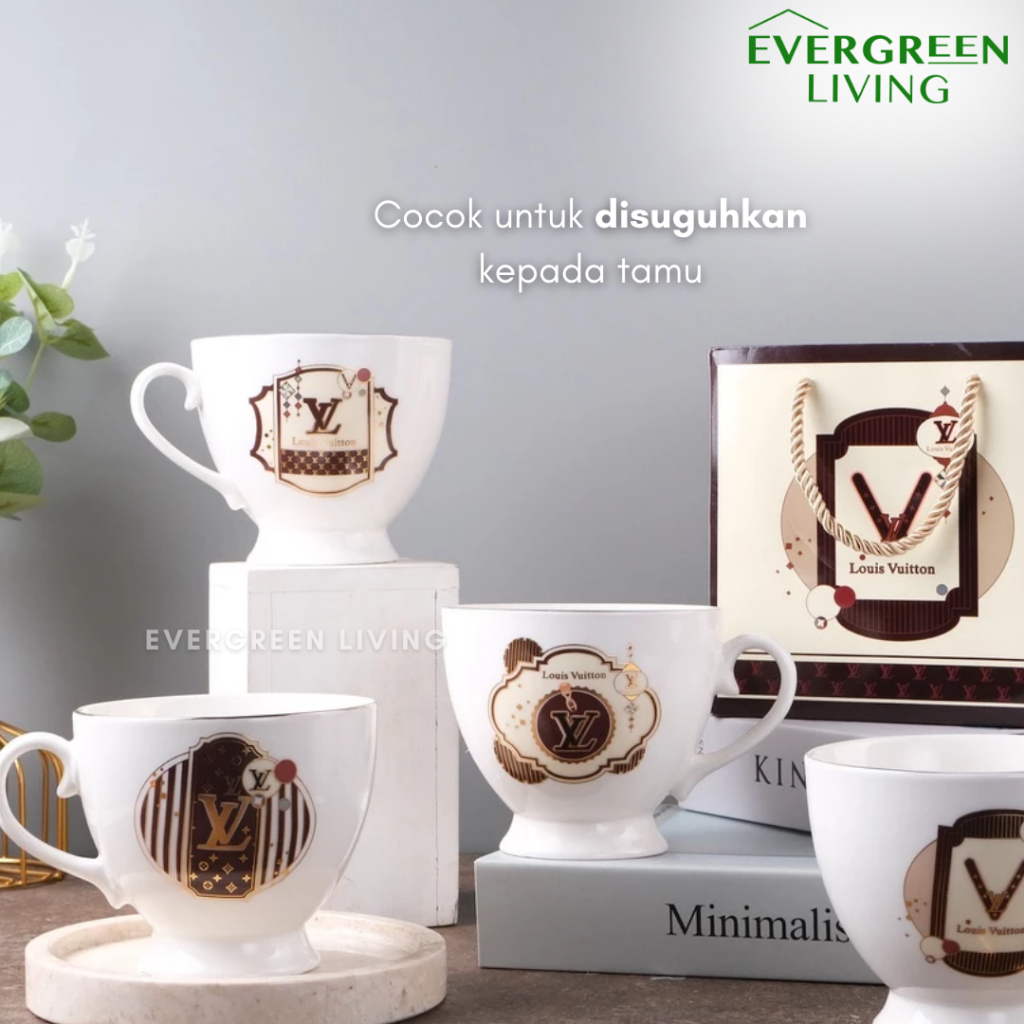 EVERGREEN Hampers Cangkir Gelas D1or / Gu33i / Lv Single Bahan Keramik Tebal Kado Ulang Tahun Nikahan Elegant Mewah Tahan Panas Luxury Kopi Teh Multifungsi