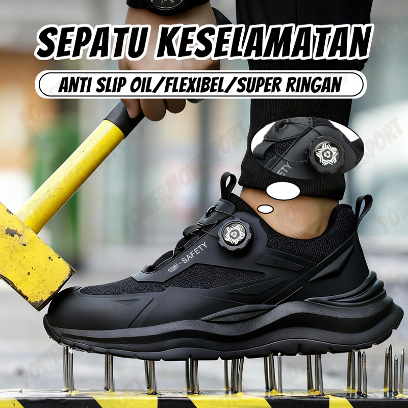 Sepatu Safety Sport Casual Hitam Pria/Sepatu Safety QS 2025 Ujung Besi Tali Putar Simple Shoelace/Anti Smash/Anti Slip O