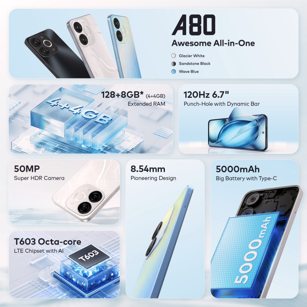 itel A80 4+4/128GB Memory - 50MP Super HDR Camera - Pioneering Design - 6.7" Punch Hole with Dynamic Bar - 5000mAh Batte
