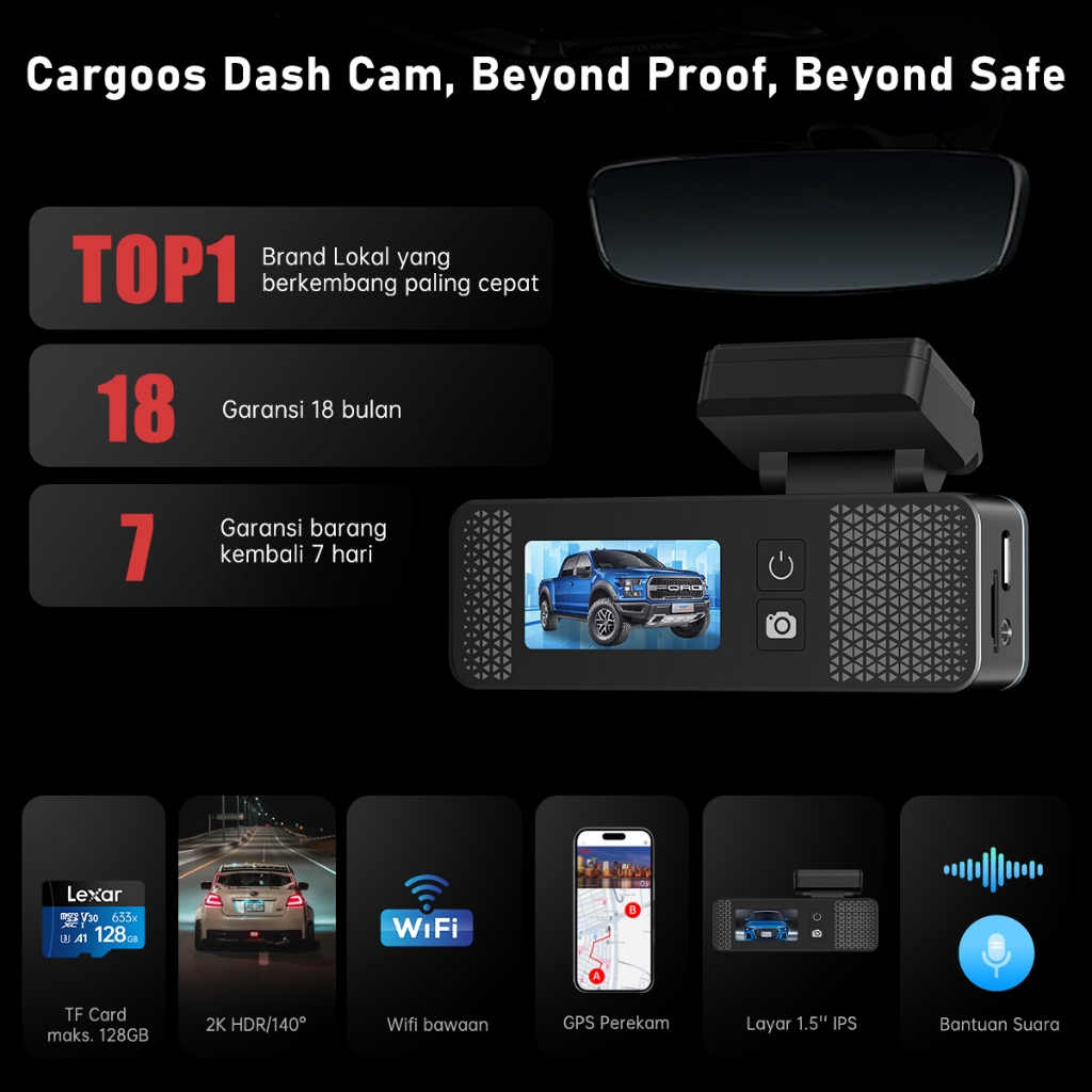 Cargoos O1 Dash Cam Mobil 2K 1440p GPS Wifi G-sensor Night Vision Kontrol Aplikasi Car Dashcam
