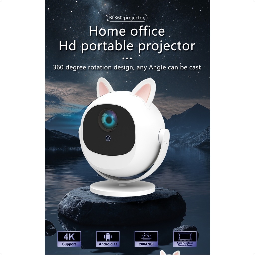 【SIENWINY】BL360 Proyektor Mini super lucu kucing telinga gaya Android 11.0 Bluetooth4.3, 200ANSI Rotasi 360°