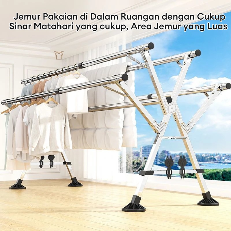 Jemuran Baju Lipat 5 Tiang Jemuran Baju Stainless Steel Jemuran Pakaian Kokoh Dan Dengan Roda Jemuran Hanger Anti Kara