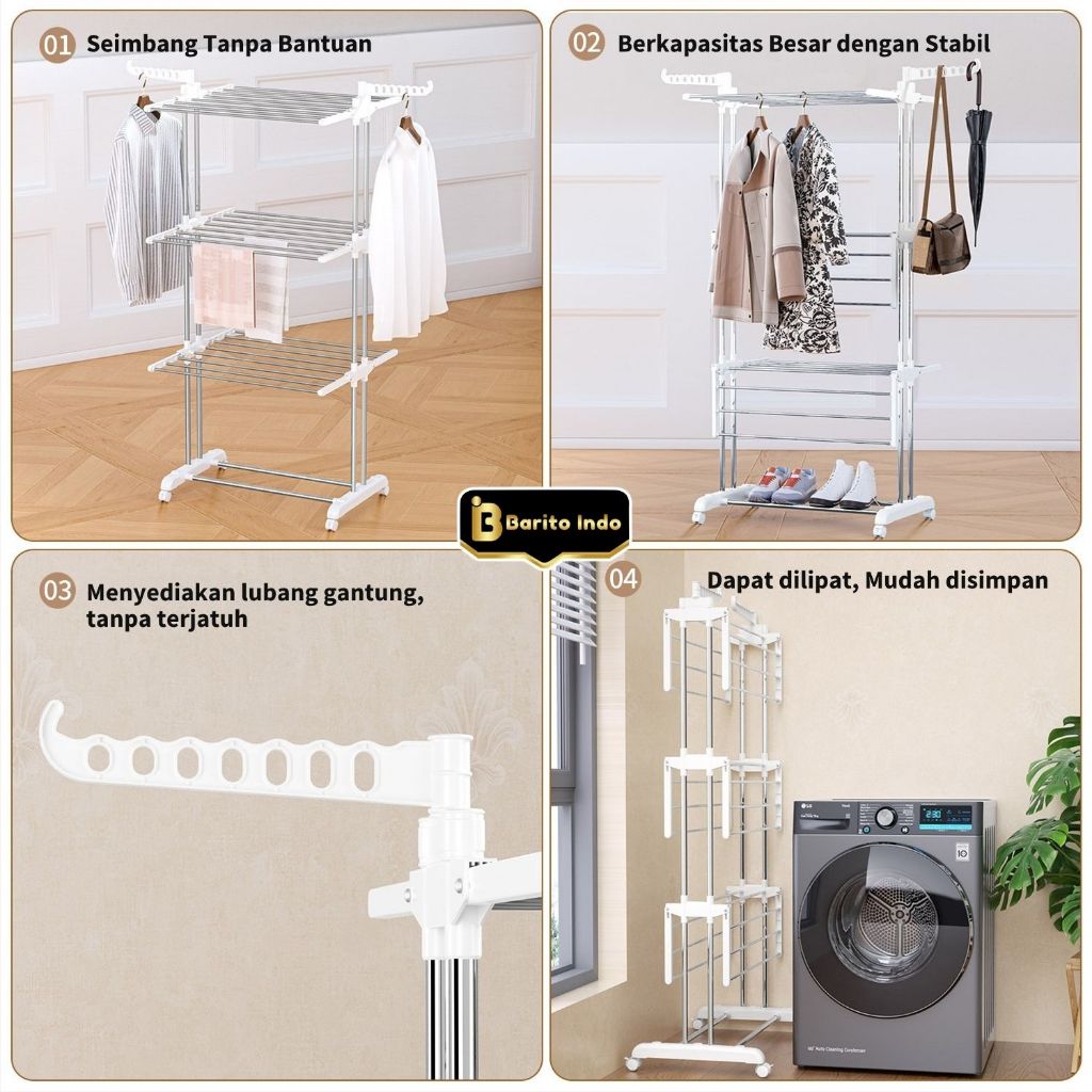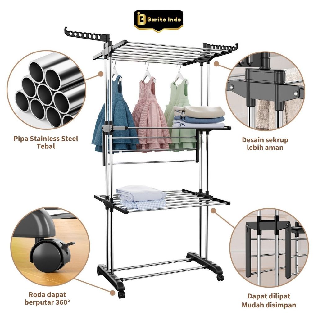 BARITOINDO Rak Jemuran Baju Lipat Roda 4 Susun Stainless Steel Anti Karat Tahan Beban 40 Kg - B03A