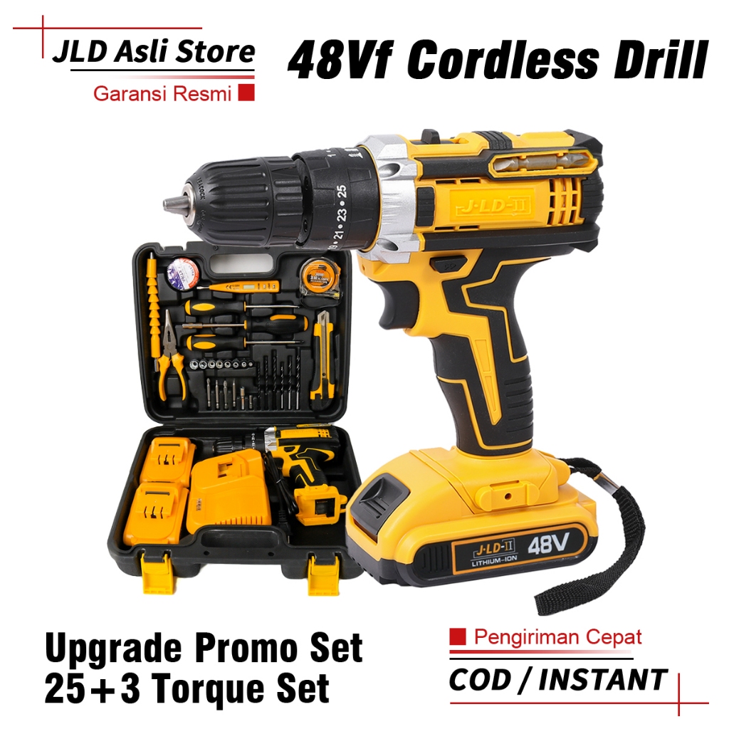 JLD 48Vf Mesin Bor Impact Baterai 2-Speeds Built-in Bit Slots&Level Bor Cas jld 2 Bater Case 25+3 Bor Cordless Impact Dr