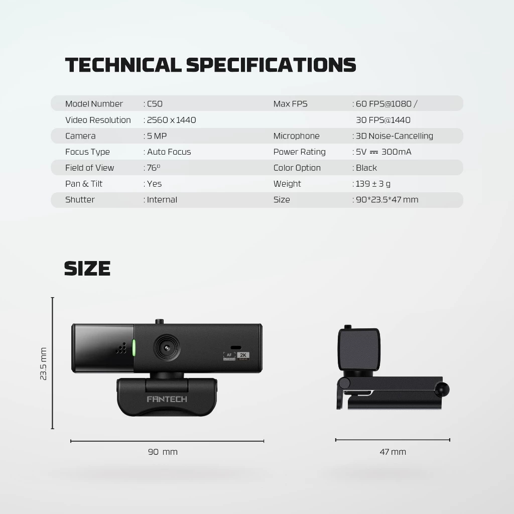 Fantech Webcam 2K Quad HD 60 FPS 1080p Auto Focus LUMINOUS C50 for PC Laptop Gaming