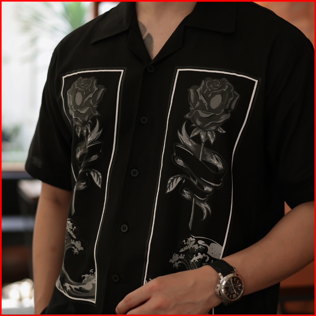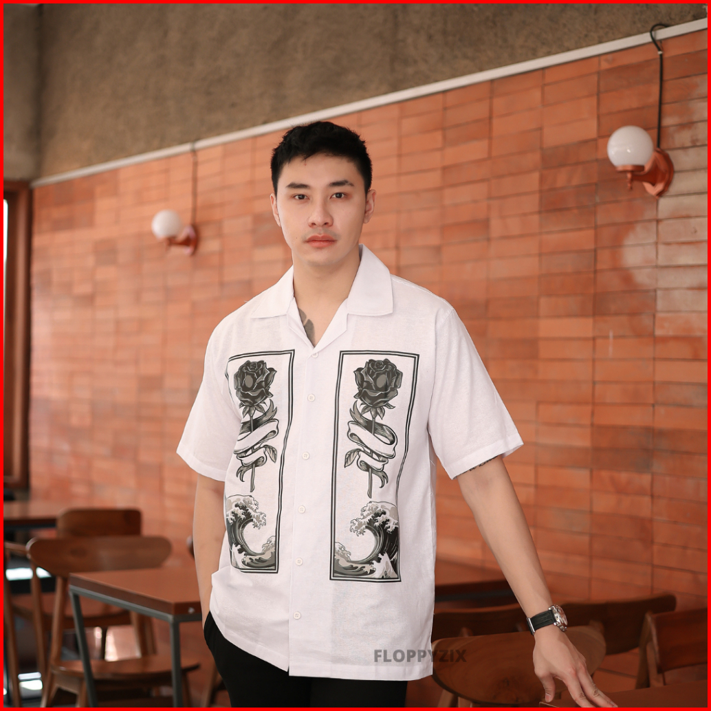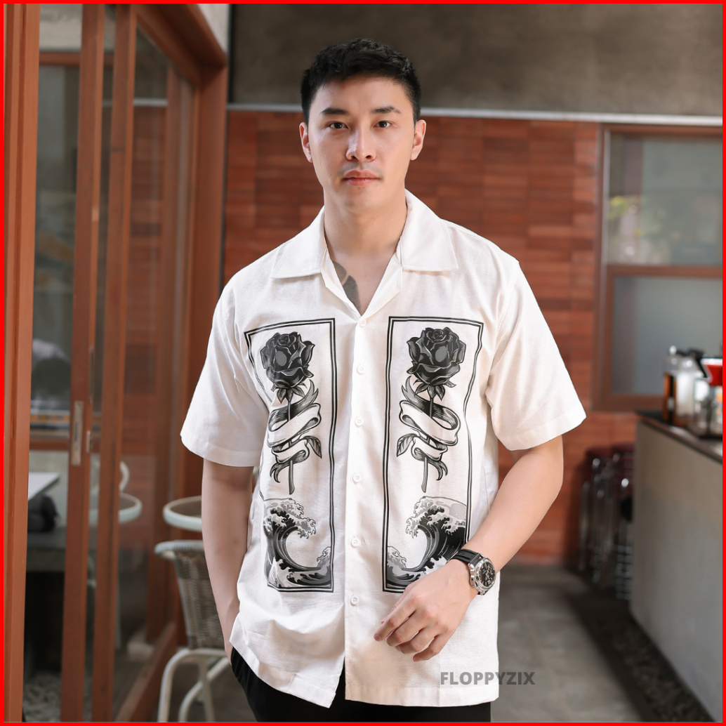 Floppy Kemeja Black Roses Kameja Pendek Pria Kameja Linen Kemeja
