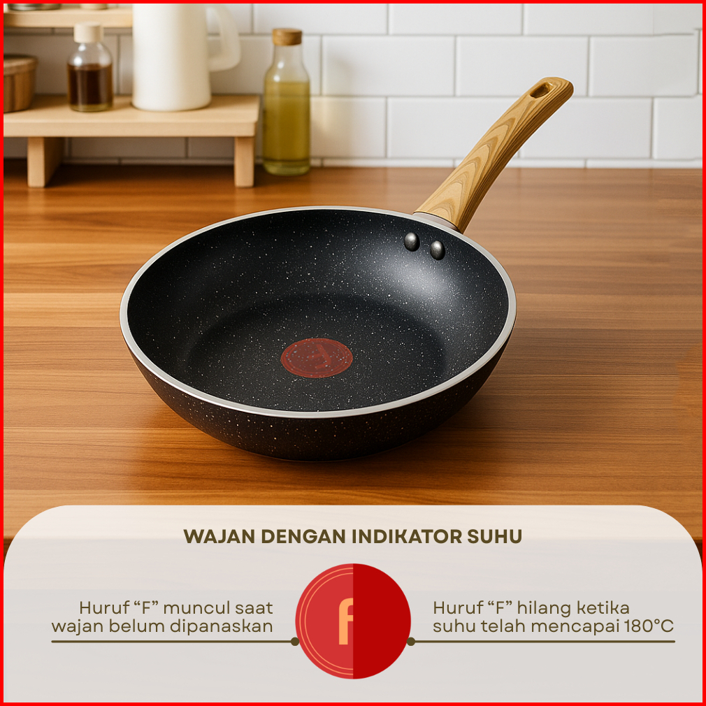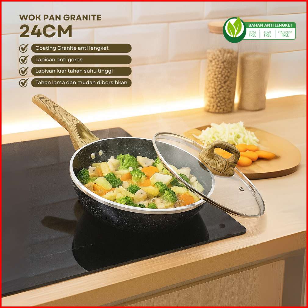 Funkoo Wok Pan 24cm Marble Coating Anti Lengket Tutup Kaca Wajan Tumis Serbaguna Food Grade